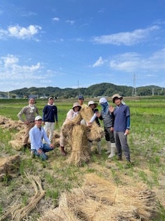 最後にワラのまとめ方を教えてもらいました。ワラをまとめるのもワラ。ワラの結び方とさらに干していたワラ12束を一纏めにするのにみなさん苦戦していました。