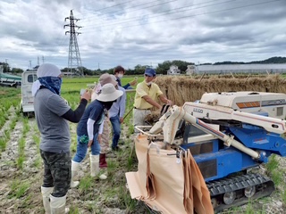 いよいよ実践!こまかな稲わらやほこりを吸い込まないようしっかりマスクをします。(アレルギー出る方もいるため超重要!)稲わらを機械に入れる人、籾袋がいっぱいになったら、籾の出す口を替え籾袋を下す人。それぞれ役割を交代しながら体験してゆきます。