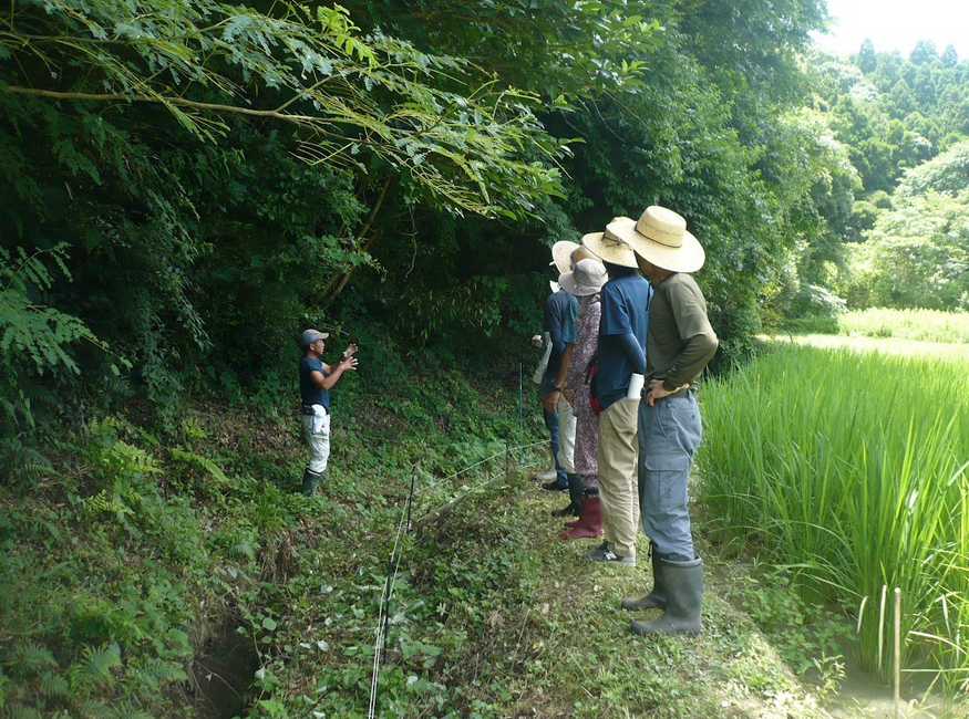 現地ではまず、獣害対策について話を聞きました。山に囲まれたこの田んぼの周辺では毎年イノシシが出ます。当初は講座で電柵を張る実技を予定していましたが、その前に田んぼにイノシシが入ったため、講座の日を待たずに電柵を張りました。イノシシ対策は待ったなしですが、実際に狩猟を行っている人はほんの一握り。獣害は増えるばかりだと言います。