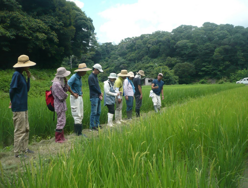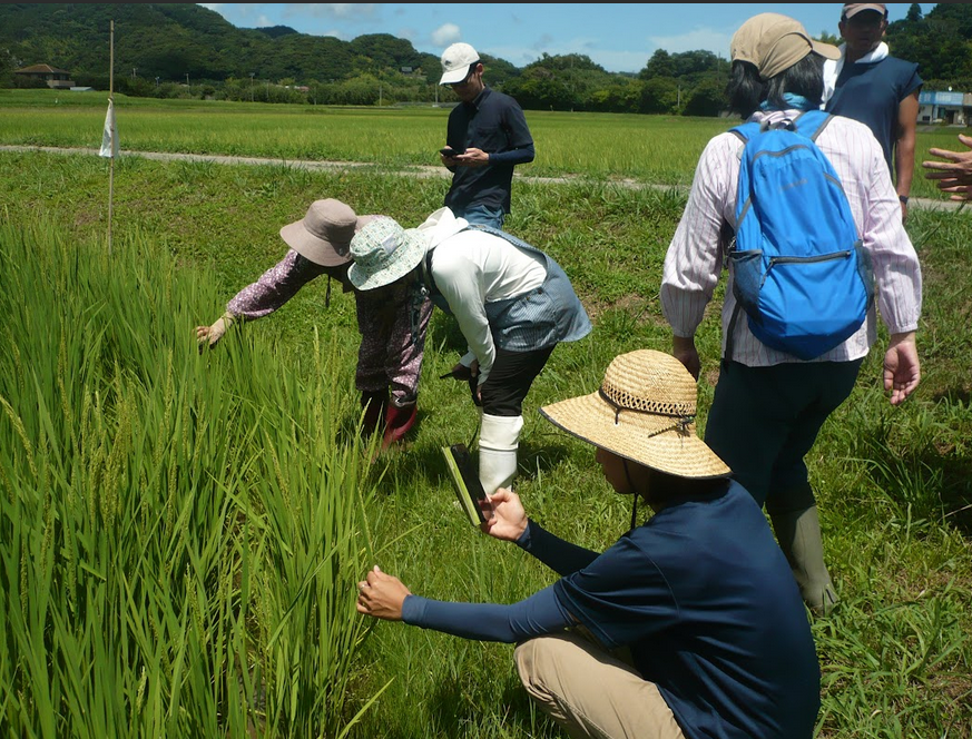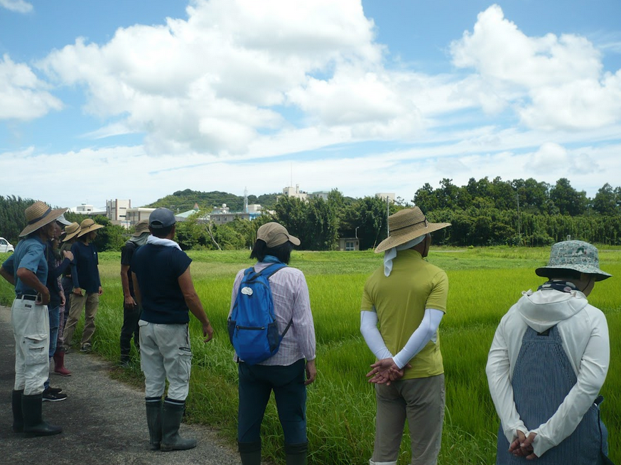 観察が終わると、別の田んぼに移動して、田んぼごとの様子の違いを観察しました。同じように育てていても、田んぼ一枚一枚、様子が異なります。草が出てしまった田んぼは葉の色が薄くなっています。「品質に影響は出るのか?」「味は変わるのか?」受講生から様々な質問が出ていました。