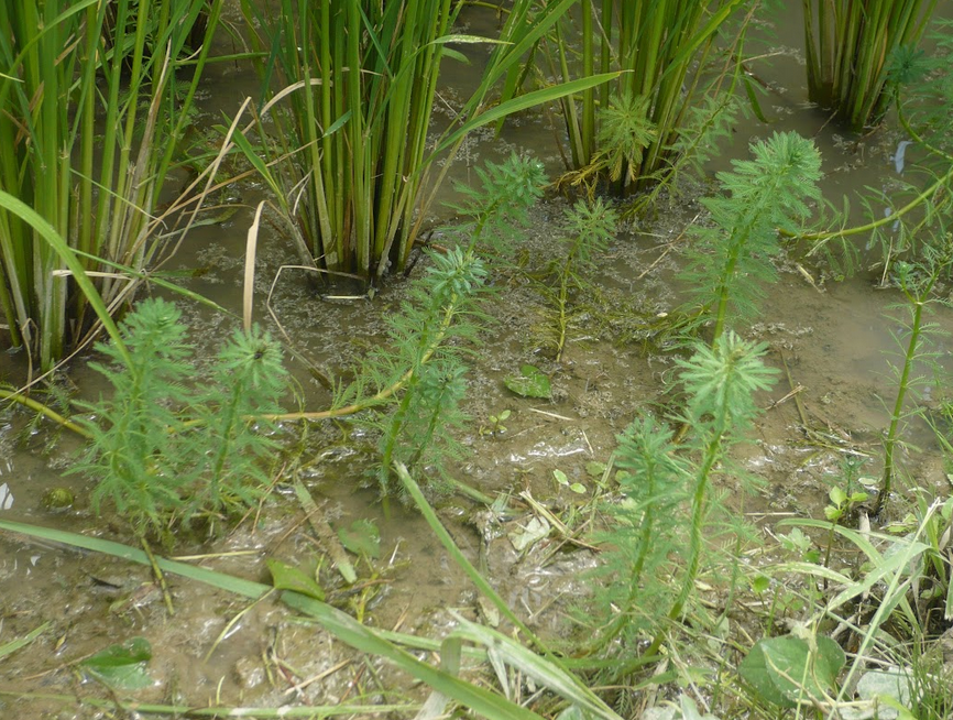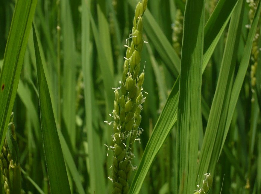 その後、田んぼをぐるりと回り、穂が出てきている稲の様子や、イノシシの入った形跡、ザリガニが稲を切った跡、外来種の雑草、稲の花が咲いている様子などを観察しました。花と言っても、花びらがあるわけではなく、白く見えているのは稲の雄しべです。とても小さく、遠目では見えないサイズです。
