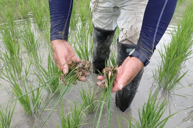 最初に、前回5月17日に田植えを行った田んぼに行き、アルミ除草機を使った除草作業を体験しました。草を生やさない管理のおかげか、あるいは大量のザリガニが住んでいるせいか、この田んぼは草を抑えるのに成功しています。(ザリガニがいると草が生えにくい一方、せっかく植えた苗をザリガニに切られてしまうという別の問題がありますが。)